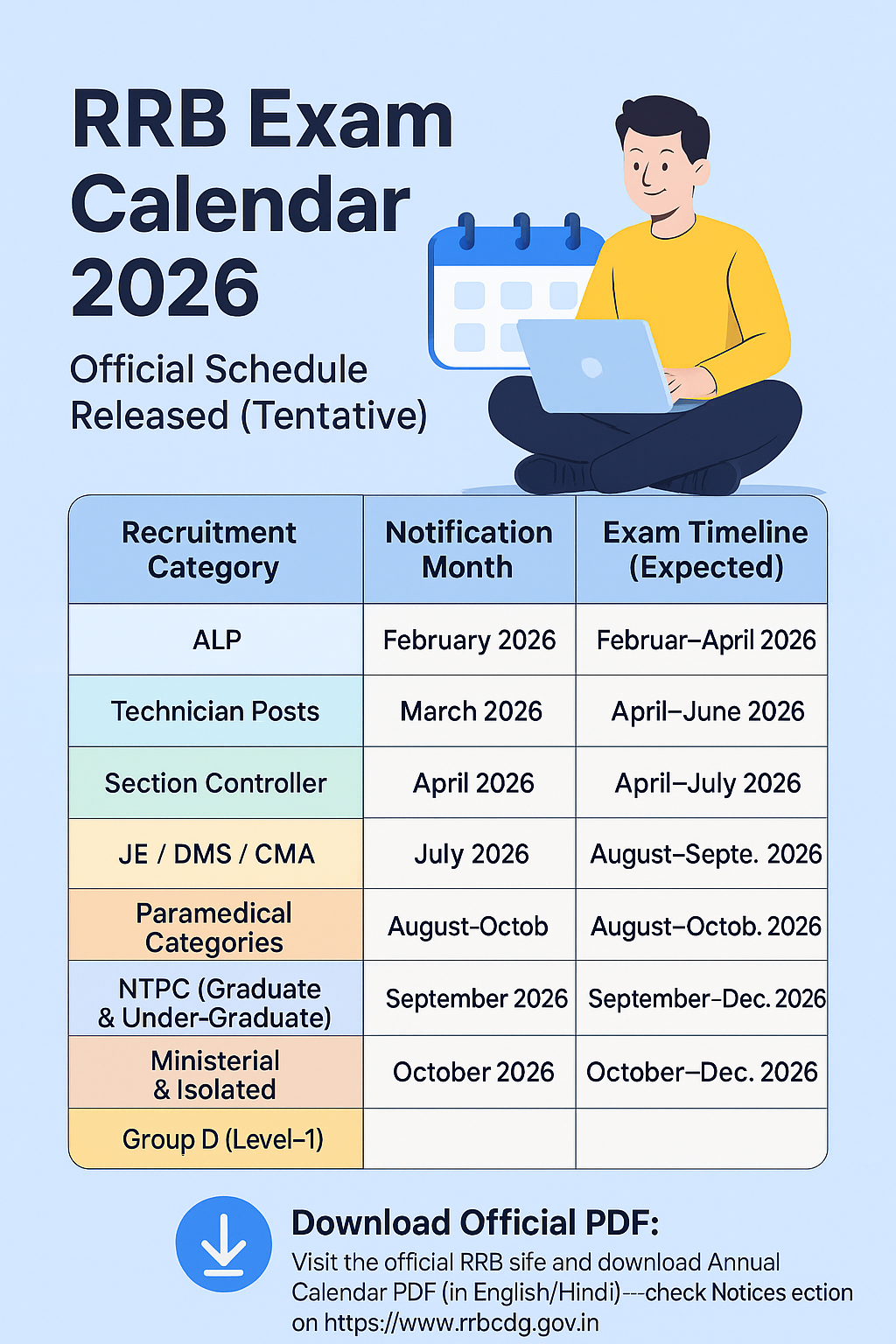 How to download: Visit the official RRB notices page (e.g., rrbcdg.gov.in) → Notices/Announcements → “RRB Annual Exam Calendar 2026” → click PDF. (Replace this placeholder with your final verified link to the PDF on RRB site before publishing.)