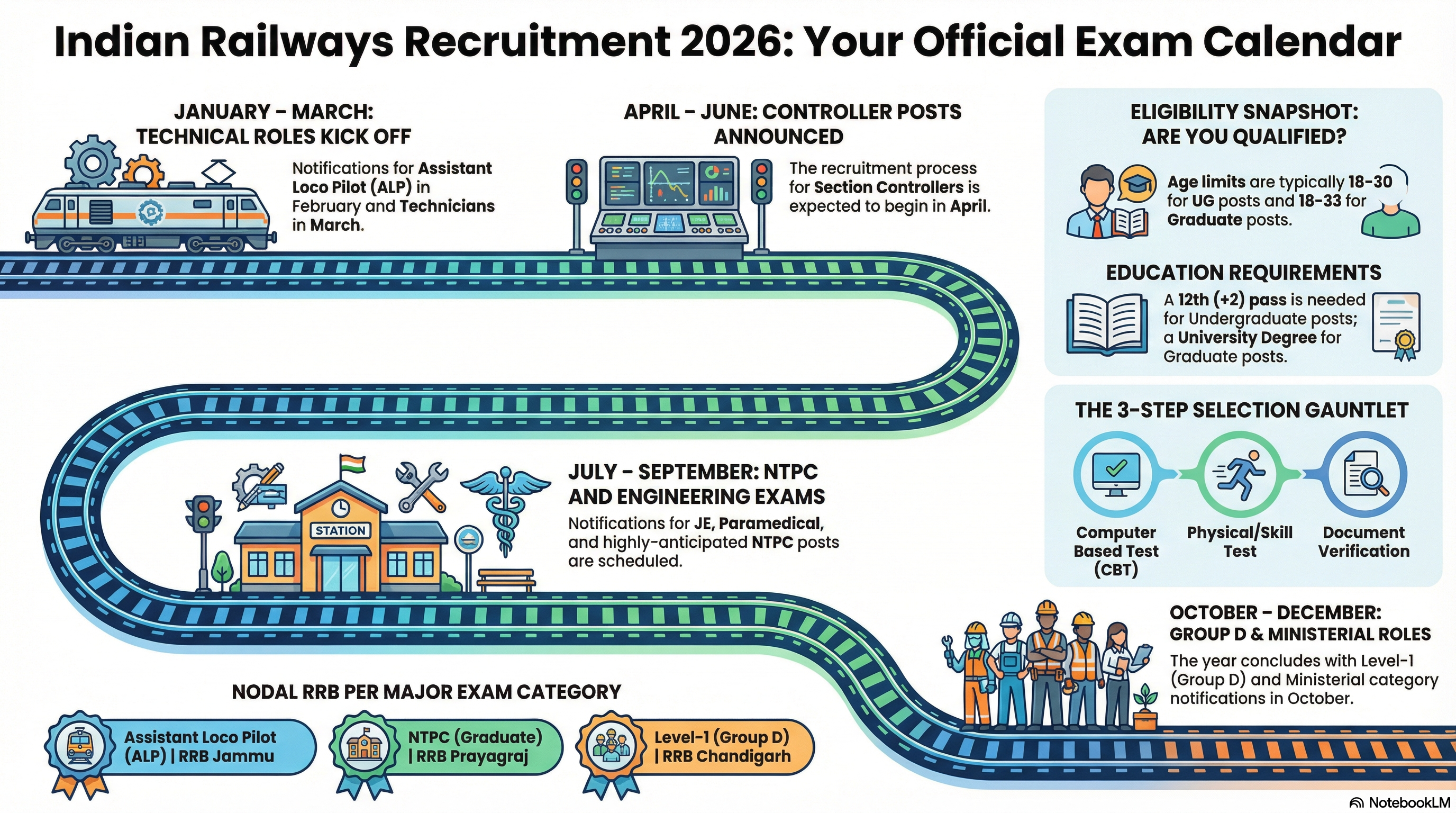 The Railway Recruitment Board (RRB) — Annual Exam Calendar 2026 is out. This post gives a quick month-wise view, official PDF download instructions, exam-wise prep checklist, and a ready-to-share infographic you can save or embed. Note: exact exam dates are published in individual CEN notifications — always verify on official RRB / regional RRB websites before applying.